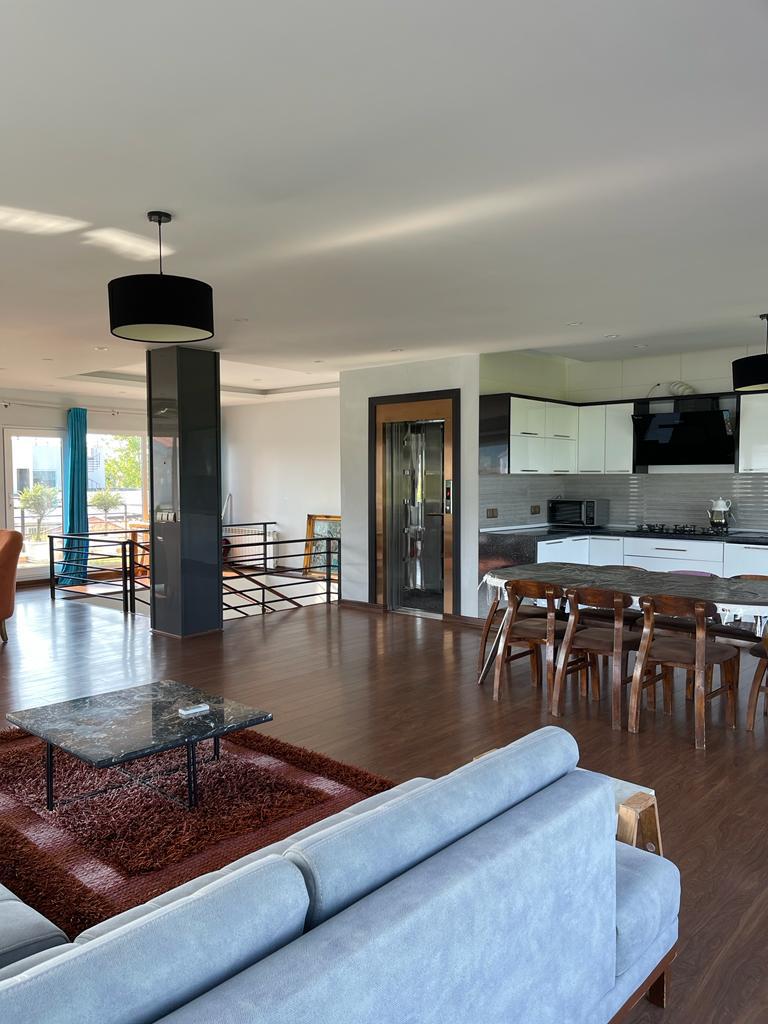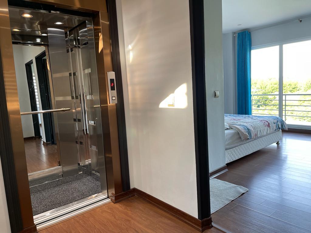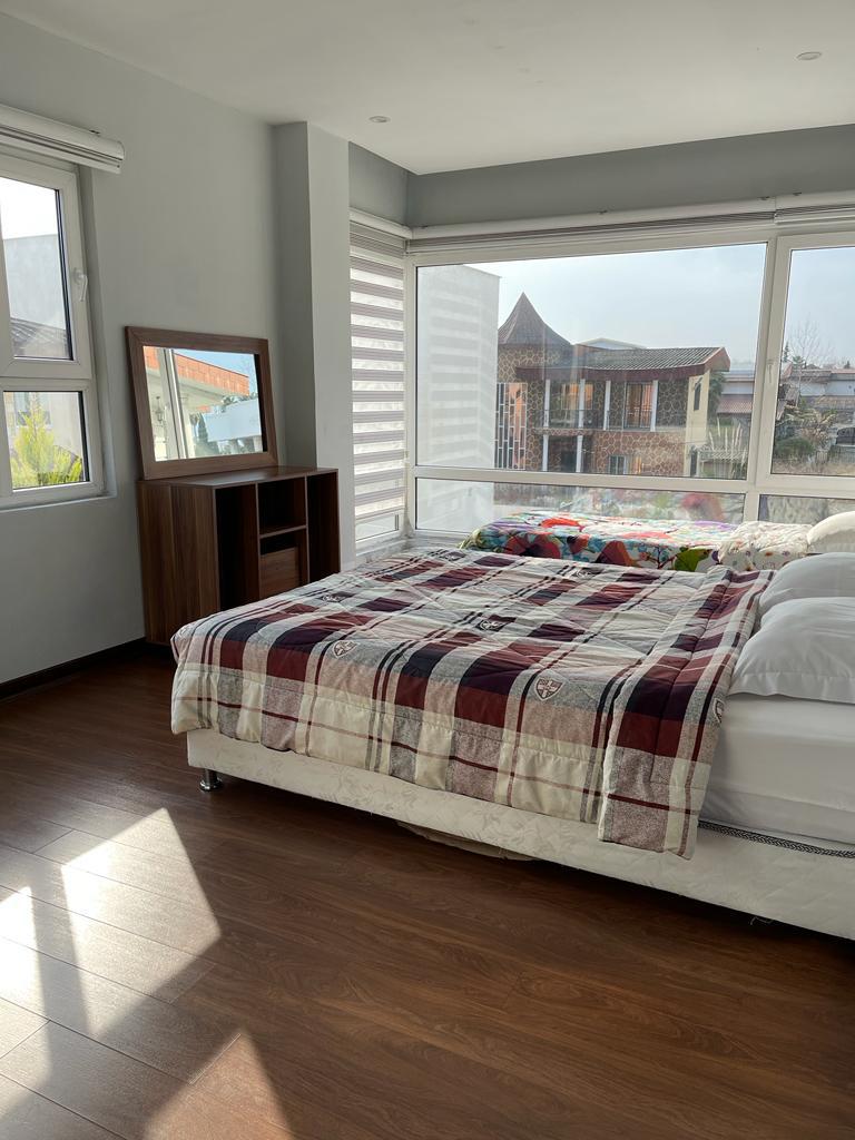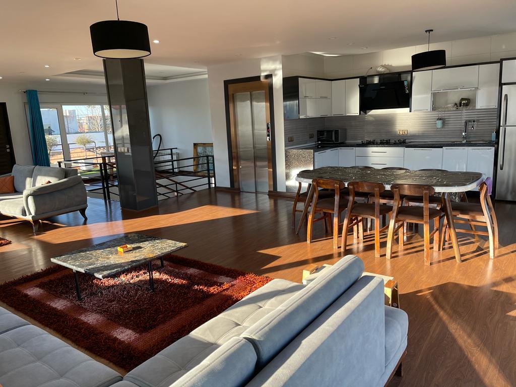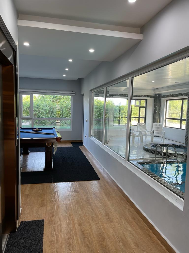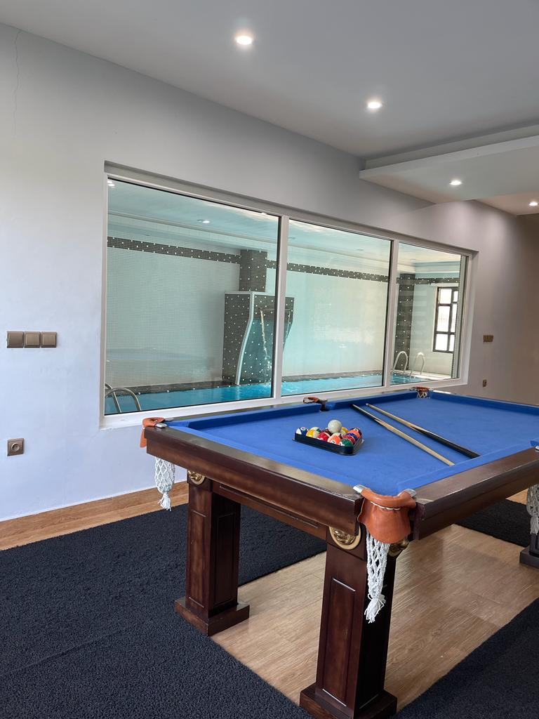 ویلا به صورت تریبلکس و دارای آسانسور می باشد که در طبقه همکف با 5 پله : استخر سرپوشیده آب گرم ، جکوزی ، میز بیلیارد ، تخته نرد ، فوتبال دستی و سرویس بهداشتی فرنگی و حمام با هم در یک فضا کنار استخر ، وجود دارد ، در طبقه اول 4 اتاق خواب که به صورت مستر می باشد ، 3 اتاق ها سرویس بهداشتی فرنگی و حمام ،