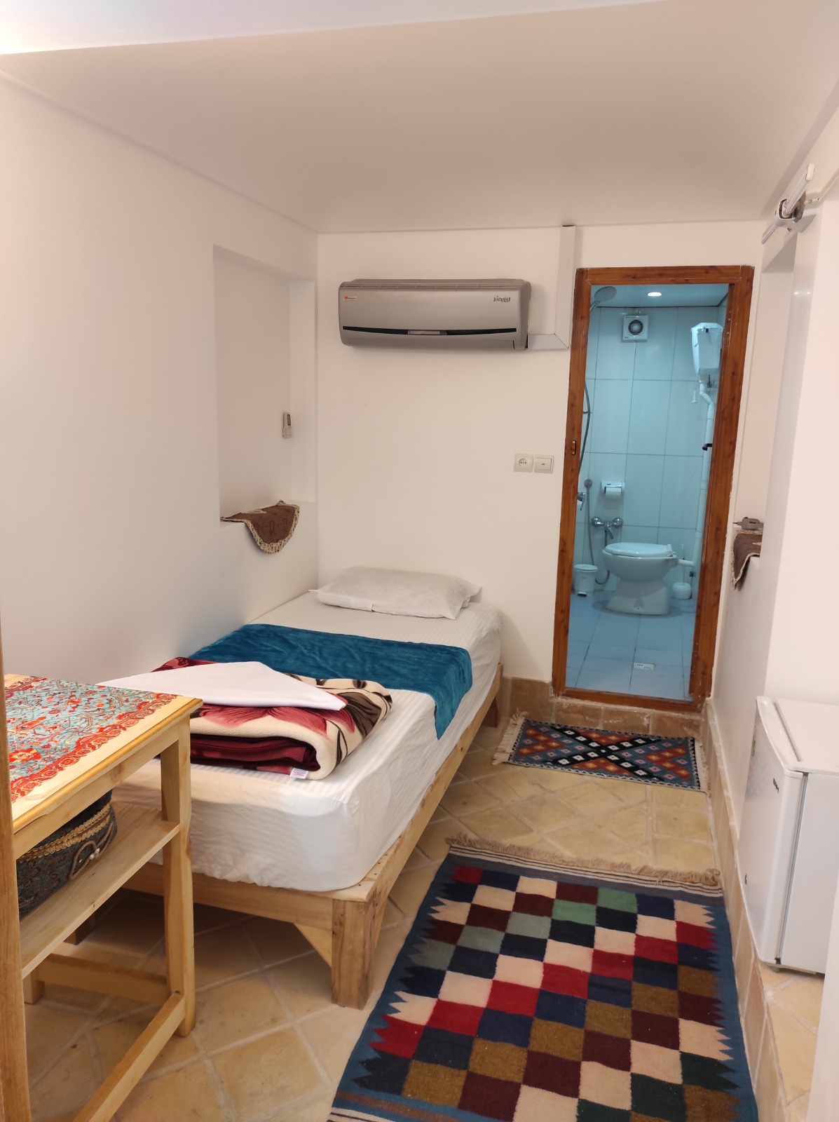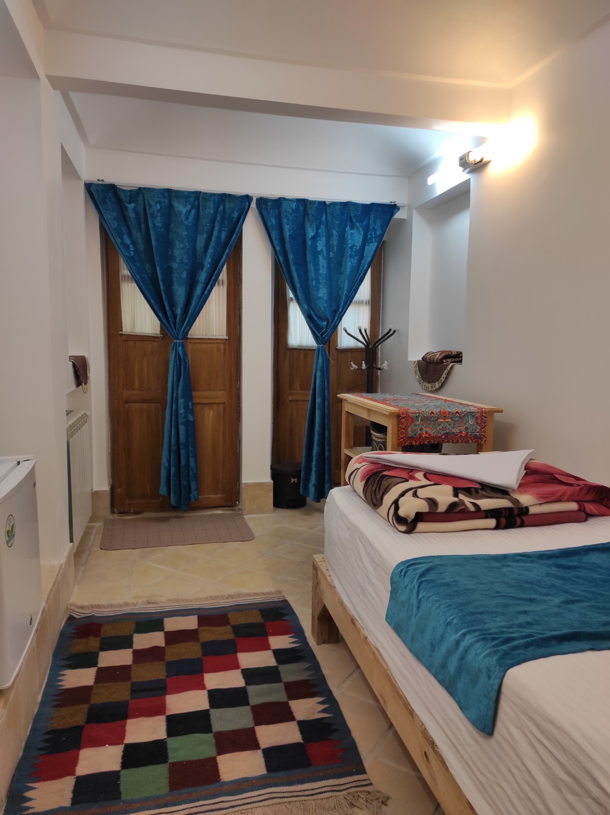 اتاق بومگردی در کاشان این اتاق سنتی با متراژ 9 متر در طبقه همکف با3 پله واقع شده است. امکانات رفاهی: اتاق مجهز به سیستم سرمایشی (اسپلیت) و گرمایشی ( شوفاژ) می باشد. این اقامتگاه لاندری دارد که فقط کارکنان بومگردی میتوانند کارهای مربوطه رو انجام دهند و مسافر اجازه ورود را ندارد. سرویس بهداشتی